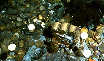 Согласно историческим источникам, в районе одной лишь бухты Ангра у острова Терсейра затонуло по меньшей мере 88 кораблей. Однако искать здесь - все равно, что пытаться найти иголку в стоге сена. Когда летом 1997 года португальско-американская экспедиция начала обследовать бухту с использованием современной аппаратуры, ученые приуныли. День за днем с борта своего судна они прощупывали дно специальными эхолотами, которые могли исследовать отложения на глубине до пяти метров. Но убедились лишь в том, что скрытые песком скалы искажают всякий сигнал. Реагирующие на металл магнитометры, способные уловить малейшие изменения магнитного поля, оказались здесь совершенно беспомощными. Не золотые слитки, монеты, якоря или пушки, а содержащие железо вулканические породы заставляли крутиться стрелки подводных компасов. "Искать здесь такими приборами металл - все равно что на дискотеке слушать через наушники Моцарта", - говорит археолог Пауло Монтейро. Лишь в акватории самой гавани исследователям повезло с находками. Под слоем осадков и горами балластных камней они обнаружили остатки четырех деревянных судов. Обломки самого старого из них, лежащие на глубине всего семи метров, относятся примерно к 1500 году - времени, когда Азорские острова были только-только открыты испанскими мореплавателями. Сейчас археологи детально обследуют самые старые из найденных здесь корабельных останков, предвкушая момент, когда под обломками откроется "золотая жила". Впрочем, возможно, что часть богатств подняли со дна сами моряки, спасшиеся с затонувших кораблей. С помощью водолазных колоколов и дыхательных шлангов они могли опускаться на глубину от десяти до двадцати метров. Уже в XVII столетии появились и первые охотники за утонувшим золотом. В 1686 году англичанин Уильям Фиппс поднял со дна Карибского моря золота и серебра на сумму, эквивалентную полутора миллионам американских долларов. То была лишь малая часть сокровищ 16 галеонов испанского "Золотого флота" (Golden Fleet), затонувших во время шторма в 1643 году на отмелях Силвер-Бэнкс к северу от Гаити. Здесь, в районе Багамских островов, Гаити (бывшей Эспаньолы) и Флоридского пролива, испанская казна потеряла в течение трех столетий баснословные богатства. Представление об их размерах может дать "улов", который за день собрал американец Герберт Хамфри, наткнувшийся на галеон "Нуэстра сеньора де лас Маравильяс" - 177 слитков серебра, 15 полукилограммовых слитков золота и 10 золотых самородков. Базой пиратов в Карибском море долгое время был остров Пинос (сейчас он называется Хувентуд и принадлежит Кубе). По преданиям, здесь прятали сокровища Дрейк, Лафитт и другие пиратские знаменитости. Появились фальшивые карты, на которых ловкие авантюристы нагрели руки. В нашем веке сюда постоянно приезжали кладоискатели, но удача улыбнулась лишь одному из них - в пятидесятых годах американец Уиккер нашел у подводного рифа сундук с золотом и драгоценностями. Еще одно известное пиратское место - принадлежащий Коста-Рике остров Кокос в Тихом океане, к северу от Галапагосских островов. Согласно летописи морского разбоя, первый клад спрятал здесь знаменитый пират Генри Морган, который был на столь хорошем счету у английских властей, что закончил свои дни в качестве губернатора Ямайки. Число кладоискателей, побывавших на Кокосе, п