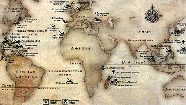 1 Карта знаменитых кладов под водой и на суше 2 Остров Оук в заливе Фанди. Тут спрятаны клады Тича и Лафитта. 3 Побережье полуострова Кейп-Код. Место находки корабля пирата Беллами "Уайды". 4 Ки-Уэст. Здесь погибли галеоны "Нуэстра сеньора де Аточа" и "Санта-Маргарита", налетевшие на рифы в 1622 году. Груз этих сокровищ оценивают в 250 млн. долларов, хотя часть сокровищ уже поднята. 6 Багамские острова. Найдены останки испанского галеона "Консепсьон", затонувшего в 1641 году. Берт Веббер поднял лишь малую часть сокровищ - 32 тонны серебра. 7 Отмели Силвер-Бэнкс. Вдоль отмелей разбросаны останки 16 испанских галеонов, затонувших в 1643 году во время шторма. Общая стоимость груза оценивается в 65 млн. долларов. 8 Остров Хувентуд (Пинос). Пиратская база в Карибском море. Возможно, что здесь спрятали свои сокровища Дрейк, Ван Хорн, Тич и другие знаменитые пираты. 9 Бухта Самана. В 1724 году затонули галеоны "Конде де Толоса" и "Нуэстра сеньора де Гваделупе" с грузом ртути, который сегодня оценили бы в 6 млн. долларов. 10 Остров Мона. Считается, что здесь зарыт клад пирата Дженнингса. Восточнее затонул его корабль, найденный в 1939 году. 11 Бухта Кумана. В результате диверсии в 1820 году взорвался галеон "Сан-Педро де Алькантра". Гарри Ризберг поднял часть груза, оцененного в 50 млн. долларов. 12 .Остров Кокос. В начале XIX века здесь были спрятаны сокровища, собранные испанцами в Перу. 13 .Залив Тобермори. Здесь обнаружен корабль Великой армады "Флоренция", но сокровищ найдено не было. 14 .Залив Ваддензе. В 1799 году затонул голланский корабль "Лютин" с 1 375 000 английских фунтов на борту. 15 .Залив Донегол. Найден галеас "Хирона", на борту которого в 1588 году находилось жалованье Великой армады. 16 .Бухта Виго. В ходе сражения с англо-голландской эскадрой было потоплено 17 испанских галеонов. Их груз до сих пор не найден. 17 .Азорские о-ва, остров Файял. В 1594 году англичане потопили португальский корабль "Чагас", перевозивший около 7 тонн золота. 18 .Остров Порто-Санто. В 1724 году затонул голландский корабль "Слот тер Хооге" с 1500 серебряных слитков на борту. Часть груза поднята бельгийцем Стенюи. 19 .Остров Св.Елены. В 1613 году португальцы потопили здесь голландский корабль "Витте Лиув" с грузом золота и 1311 бриллиантами. 20 .Балаклавская бухта. Миллион фунтов стерлингов, утонувший вместе с кораблем "Принц" до сих пор не найден. 21 .Остров Занзибар. Принято считать, что здесь зарыты клады английских пиратов Кидда и Эйвери. 22 .Сейшелы: о-ва Фаркуар, Альдабра, Провиденс, Маэ. Сейчас здесь ведутся поиски кладов французских корсаров. 23 .Мадагаскар, мыс Масуала. В XVIII веке поблизости от этого мыса находились базы многих пиратов, в том числе Ингленда и Левассера. 24 .Остров Маврикий. Здесь могут находиться клады Сюркуфа - французкого пирата рубежа XVIII и XIX столетий. 25 .Остров Реюньон. Согласно свидетельствам, здесь в XVIII столетии спрятали свои сокровища пираты Ингленд, Тейлор и Левассер. 26 .Малаккский пролив. В 1511 годуразбился на рифах флагман португальского флота "Флер де ла Мар". Его груз оценивается в 9 млрд. долларов. 27 .Остров Сайпан. Здесь в 1638 году потерпел крушение галеон "Нуэстра сеньора де ла Консепсьон". Часть груза удалось спасти команде, а в 1987 году кладоискатели нашли на дне еще 1300 золотых украшений. 28 .Манилльский залив. Франк Годдио обнаружил здесь потопленный в 1600 году испанский галеон "Сан-Диего". 29 .Остров Грайген. 
